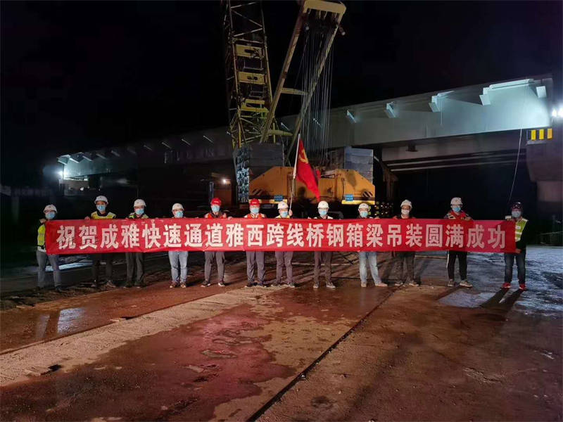 雅西跨線橋是成雅快速通道(雅安段)新建工程重要組成部分,該橋為單跨簡支鋼箱梁橋,全橋設(shè)計鋼箱梁4片,單片重量約140噸、長55余米,體積大、自身重、運輸困難,且投入的大型機械設(shè)備較多,施工組織難度大。為順利完成架設(shè)任務(wù),市交通局會同市交建集團、交建項目管理公司、市公安局交警支隊和各參建單位多次組織召開專題會議,提前謀劃、細致安排、優(yōu)化組織,制定了施工專項方案和應急措施,使整個施工過程按照標準化、程序化、規(guī)范化進行施工,為鋼箱梁的成功吊裝奠定了堅實的基礎(chǔ)。