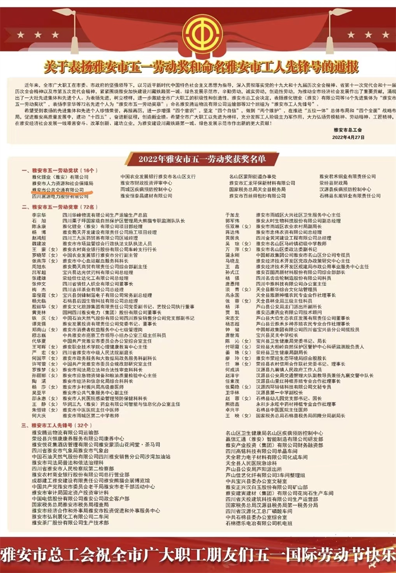 此次大會(huì)表彰雅安市五一勞動(dòng)獎(jiǎng)狀16個(gè)、雅安市五一勞動(dòng)獎(jiǎng)?wù)?2名、雅安市工人先鋒號(hào)32個(gè),雅安市公共交通有限公司獲得“雅安市五一勞動(dòng)獎(jiǎng)狀”榮譽(yù)稱(chēng)號(hào)。