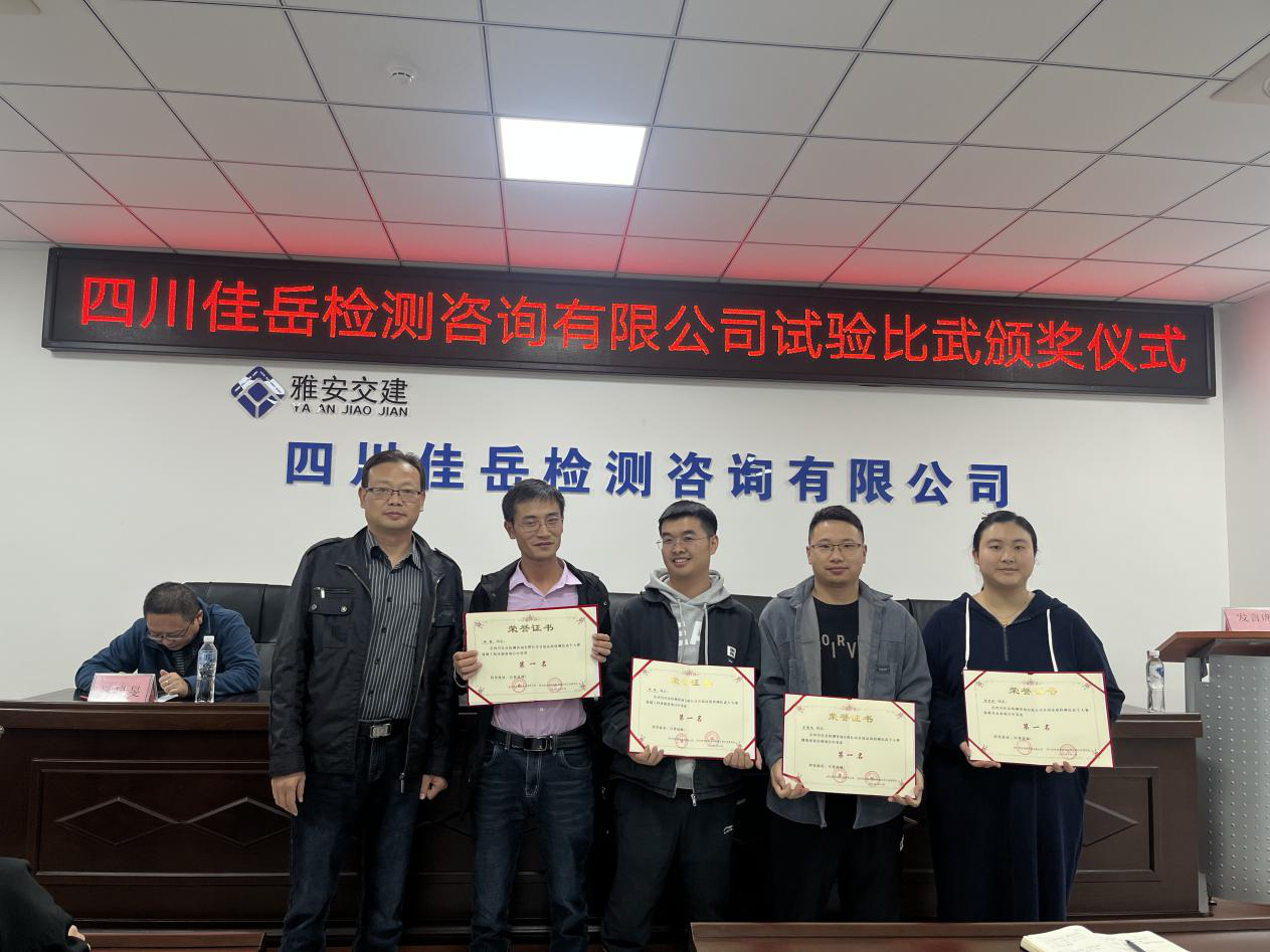 四川佳岳檢測(cè)咨詢有限公司第一屆試驗(yàn)檢測(cè)技能比武大賽自10月17日開賽以來,來自四川佳岳檢測(cè)咨詢有限公司和雅安市重點(diǎn)工程監(jiān)理單位、工程試驗(yàn)室的員工積極參加比賽,歷時(shí)21天,取得圓滿成功。本次比賽項(xiàng)目設(shè)個(gè)人賽7項(xiàng)、團(tuán)體賽1項(xiàng),其中團(tuán)體賽和個(gè)人賽分別設(shè)第一、二、三等獎(jiǎng)項(xiàng)各1名。最終,佳岳公司以過硬的技能,獲得團(tuán)體賽第一名,個(gè)人賽第一名6項(xiàng)、第二名7項(xiàng),第三名6項(xiàng)。