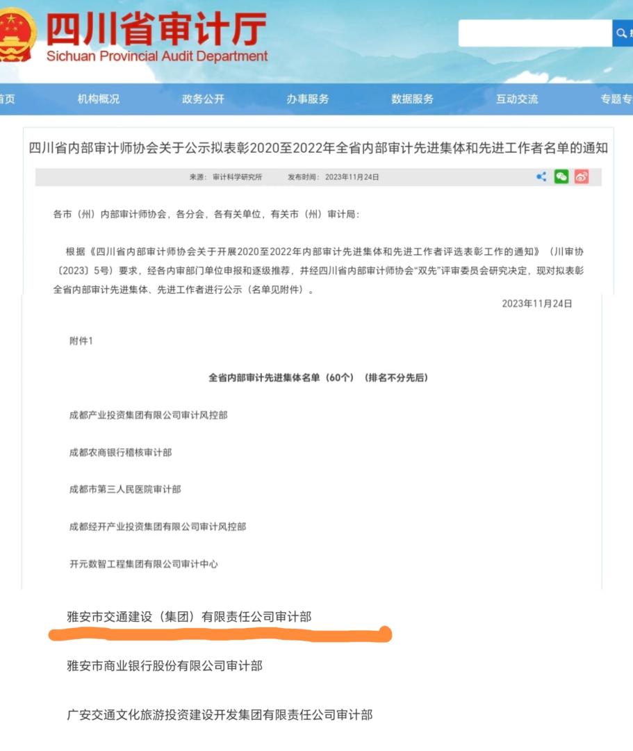 11月24日,四川省審計廳發(fā)布《四川省內(nèi)部審計師協(xié)會關(guān)于公示擬表彰2020至2022年全省內(nèi)部審計先進集體和先進工作者名單的通知》,雅安市交通建設(shè)(集團)有限責(zé)任公司審計部榮獲“2020至2022年全省內(nèi)部審計先進集體”。
