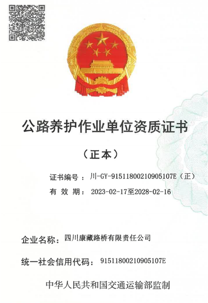 日前,四川康藏路橋有限責任公司成功通過四川省交通運輸廳資質(zhì)申報評審,順利取得路基路面養(yǎng)護乙級資質(zhì)證書,成為目前雅安唯一獲得此養(yǎng)護資質(zhì)的作業(yè)單位。