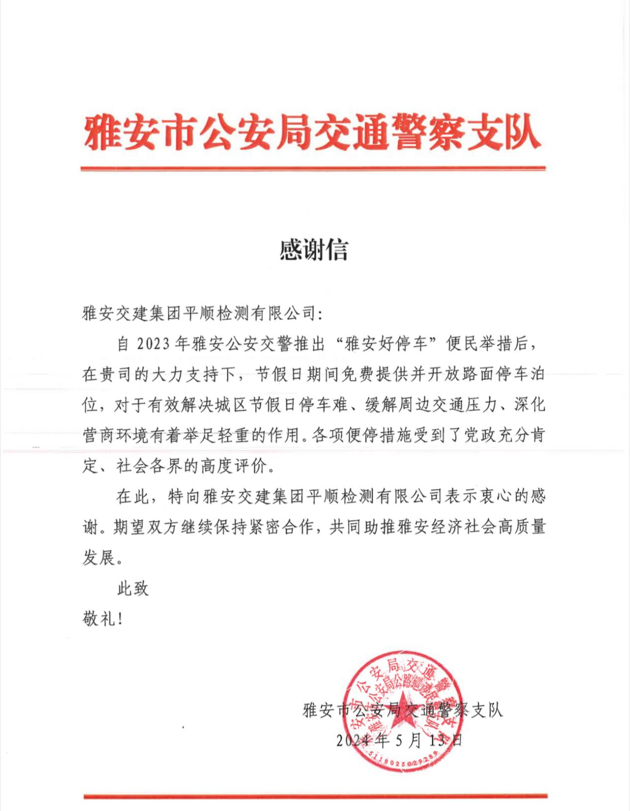 近日,雅安交建集團平順公司收到一封來自雅安市公安局交通警察支隊的感謝信,對平順公司積極響應雅安公安交警“雅安好停車”便民措施,在節(jié)假日期間免費提供并開放路面停車泊位表示感謝。