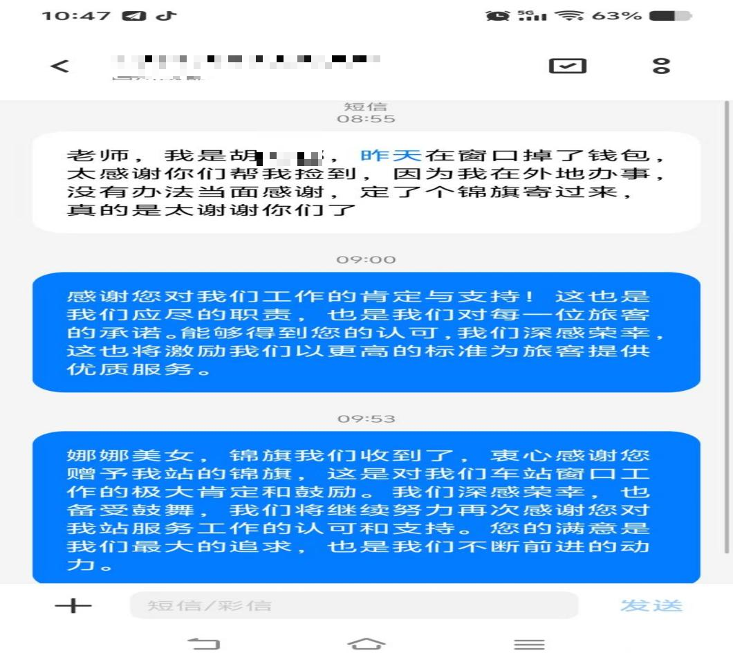 5月14日11時11分,售票員郝凌云發(fā)現(xiàn)柜臺上遺留了一個卡包,內(nèi)有現(xiàn)金 300 元、多張銀行卡、身份證及社?ǖ戎匾锲贰:铝柙频谝粫r間上報值班科長,通過站務(wù)系統(tǒng)比對購票信息,僅用5分鐘便鎖定失主為即將前往漢源的旅客胡女士,此時胡女士正在等待檢票,尚未察覺錢包丟失。值班站長通過廣播系統(tǒng)緊急尋人,胡女士聽到廣播后立即前往值班室認領(lǐng)物品,經(jīng)值班科長仔細核對身份及物品信息后,將卡包完好歸還。胡女士激動致謝:“太感謝你了!你們汽車站的工作人員素質(zhì)真高,太讓人暖心了!”