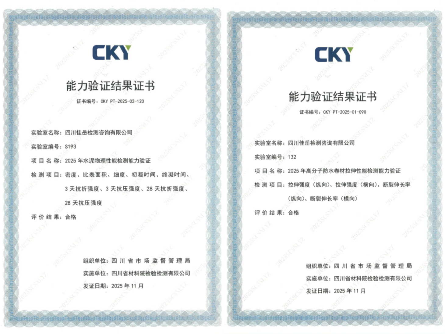 近日,佳岳公司順利完成2025年度檢測(cè)能力驗(yàn)證工作,“高分子防水卷材拉伸性能檢測(cè)”與“水泥物理性能檢測(cè)”兩項(xiàng)項(xiàng)目結(jié)果均獲“滿(mǎn)意”評(píng)價(jià)。