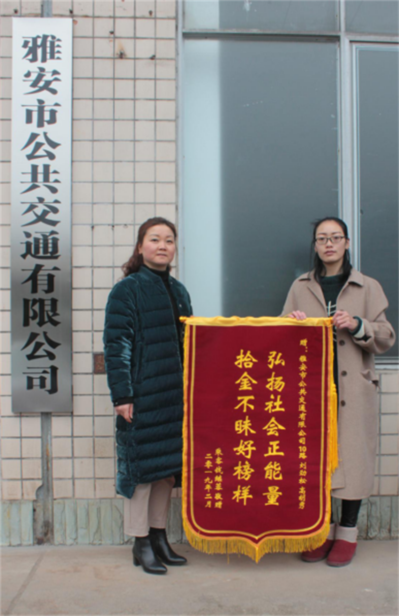 “請(qǐng)一定把我們的感謝帶給駕駛員和發(fā)班員!2月14日下午17時(shí)15分左右,一名手拿寫著“拾金不昧好榜樣弘揚(yáng)社會(huì)正能量”錦旗的市民錢續(xù)露來到雅安市公共交通有限公司,將錦旗送到了經(jīng)理助理方媛手上,請(qǐng)她把感謝之意轉(zhuǎn)達(dá)給10路公交車駕駛員劉進(jìn)松和發(fā)班員高胡秀。