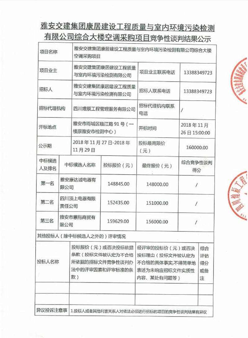 綜合大樓空調(diào)采購項目競爭性談判結(jié)果公示