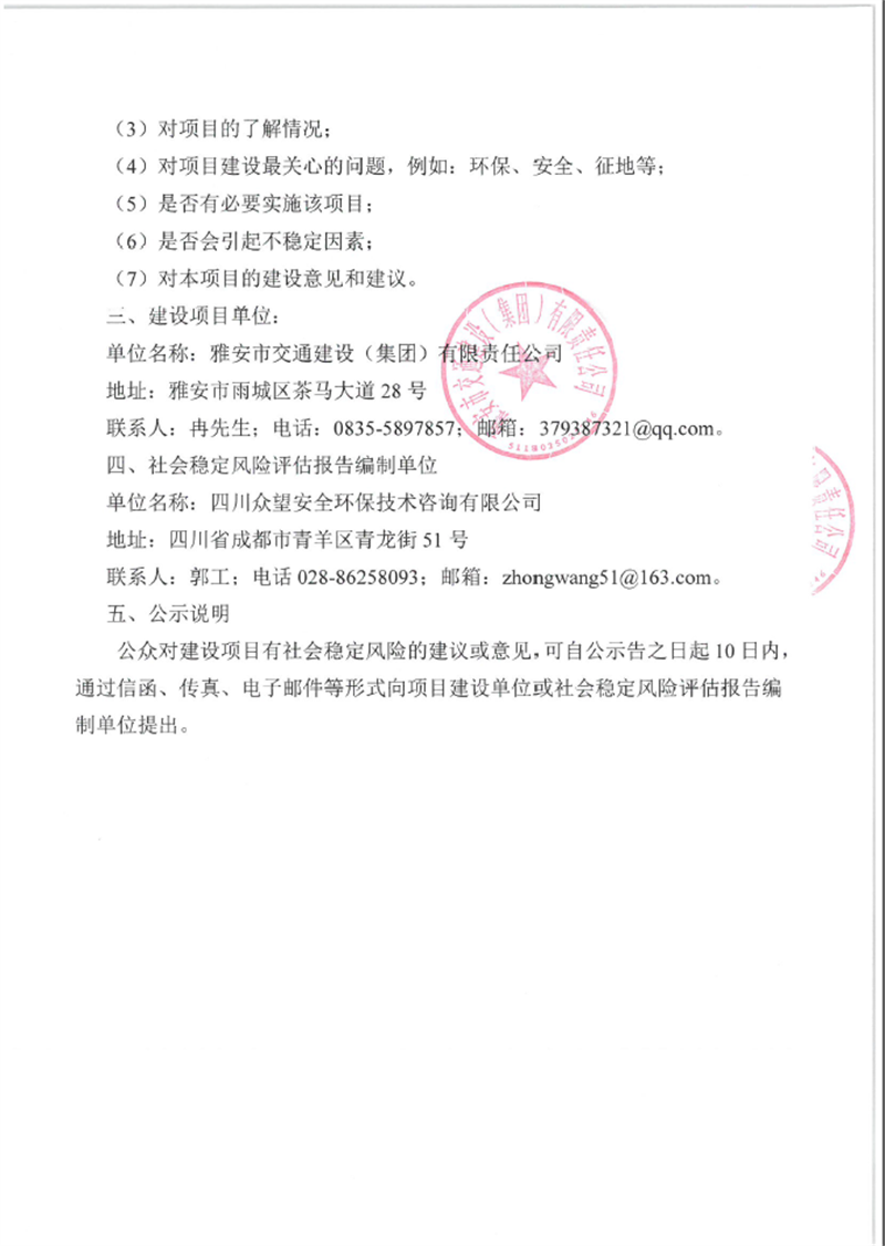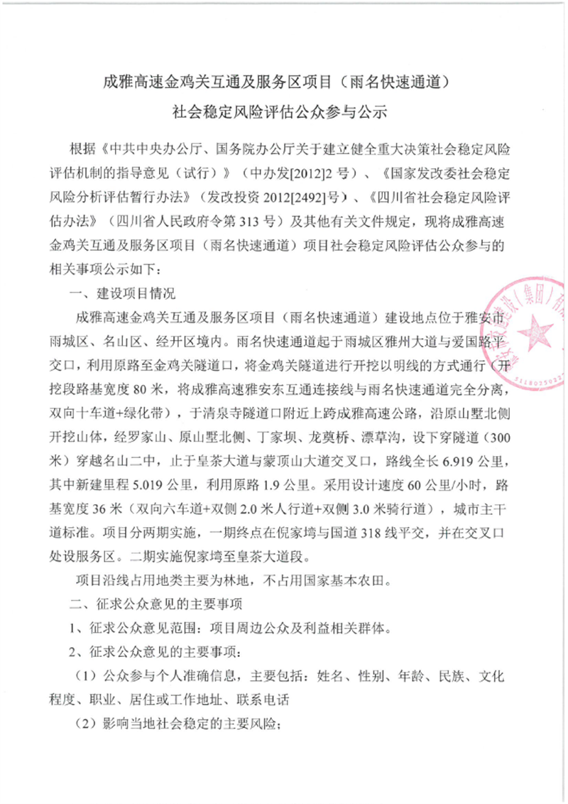 成雅高速金雞關(guān)互通及服務區(qū)項目(雨名快速通道)社會穩(wěn)定風險評估公眾參與公示
