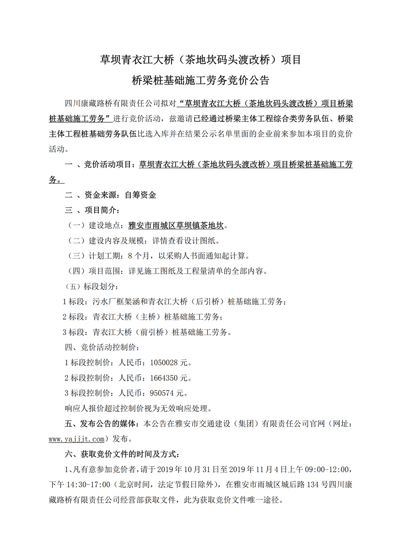 四川康藏路橋有限責(zé)任公司草壩青衣江大橋(茶地坎碼頭渡改橋)項(xiàng)目橋梁樁基礎(chǔ)施工勞務(wù)競價公告