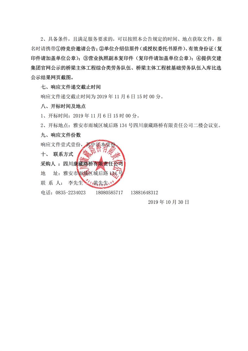 四川康藏路橋有限責(zé)任公司省道104線草壩至姚橋段改建工程項(xiàng)目橋梁樁基礎(chǔ)施工勞務(wù)競價公告