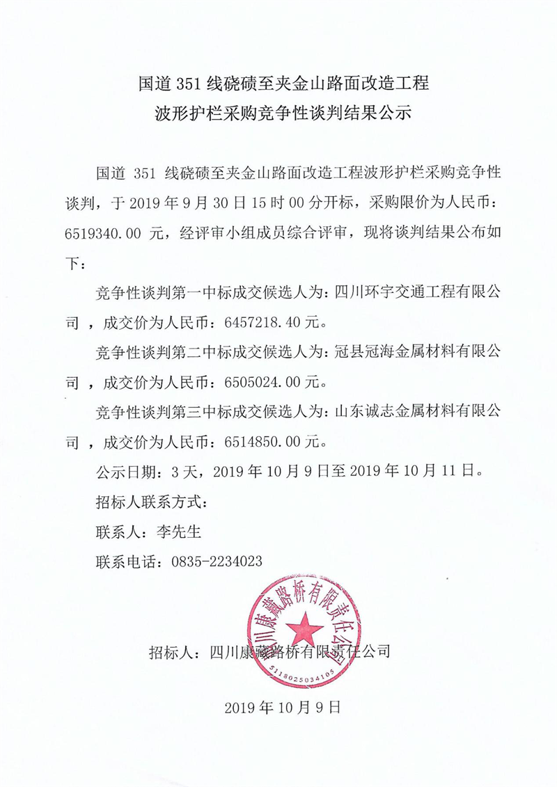 四川康藏路橋有限責(zé)任公司國道351線磽磧至夾金山路面改造工程波形護(hù)欄采購競爭性談判結(jié)果公示