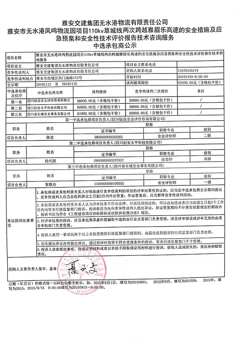 雅安交建集團無水港物流有限責任公司雅安市無水港鳳鳴物流園項目110kv草城線兩次跨越雅眉樂高速的安全措施、應急預案以及安全性技術(shù)評價報告技術(shù)咨詢服務中選承包商公示