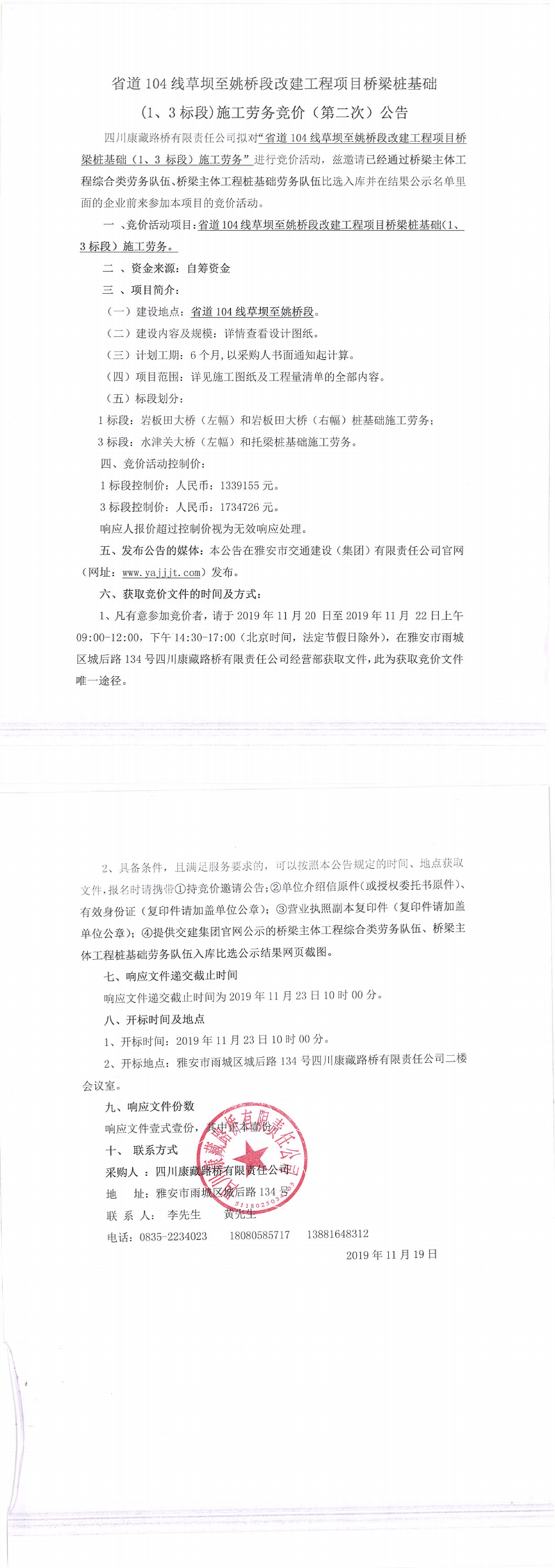 四川康藏路橋有限責任公司省道104線草壩至姚橋段改建工程項目橋梁樁基礎(chǔ)(1、3標段)施工勞務(wù)競價(第二次)公告
