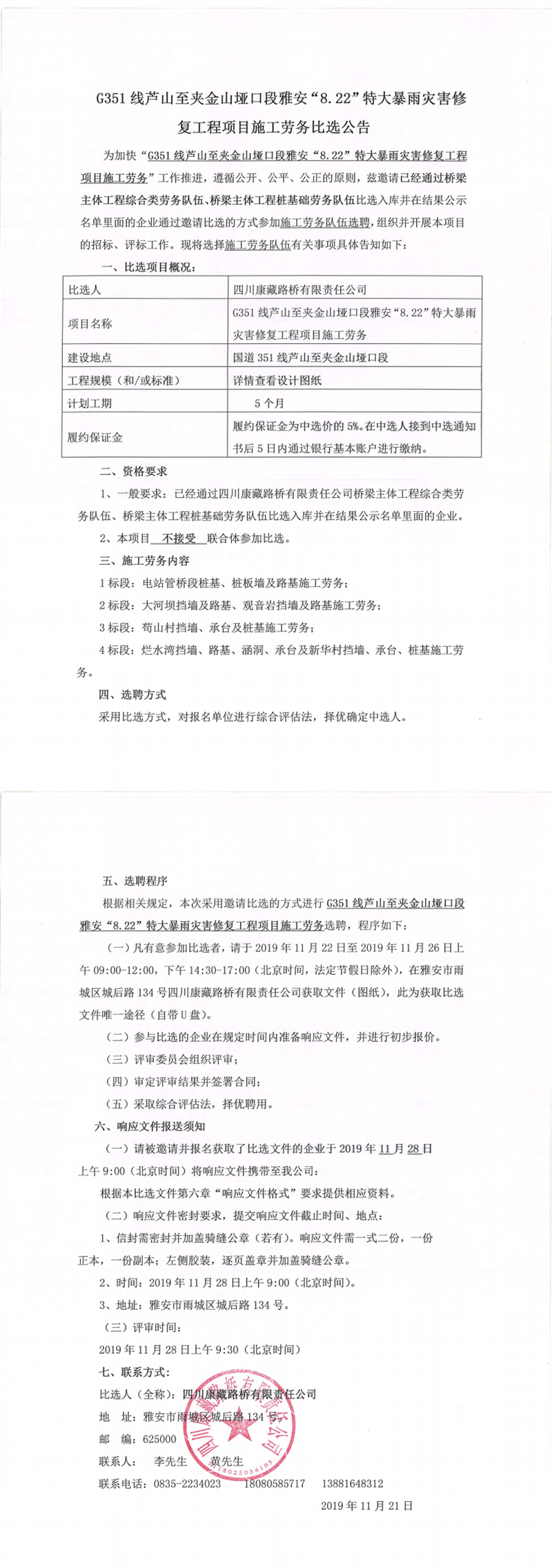 四川康藏路橋有限責(zé)任公司G351線蘆山至夾金山埡口段雅安“8.22”特大暴雨災(zāi)害修復(fù)工程項目施工勞務(wù)比選公告