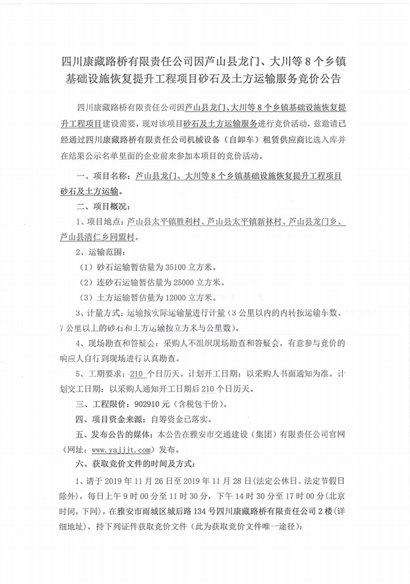 四川康藏路橋有限責(zé)任公司蘆山縣龍門、大川等8個鄉(xiāng)鎮(zhèn)基礎(chǔ)設(shè)施恢復(fù)提升工程項(xiàng)目砂石及土方運(yùn)輸服務(wù)競價公告