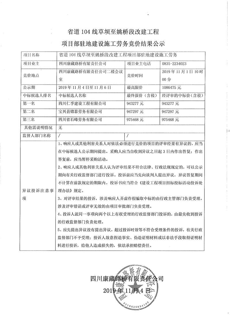 四川康藏路橋有限責任公司省道104線草壩至姚橋段改建工程項目部駐地建設施工勞務競價結果公示