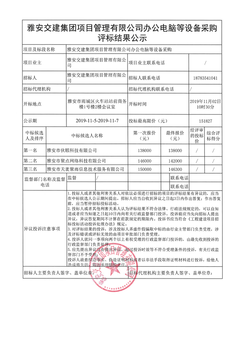 雅安交建集團(tuán)項目管理有限公司辦公電腦等設(shè)備采購評標(biāo)結(jié)果公示