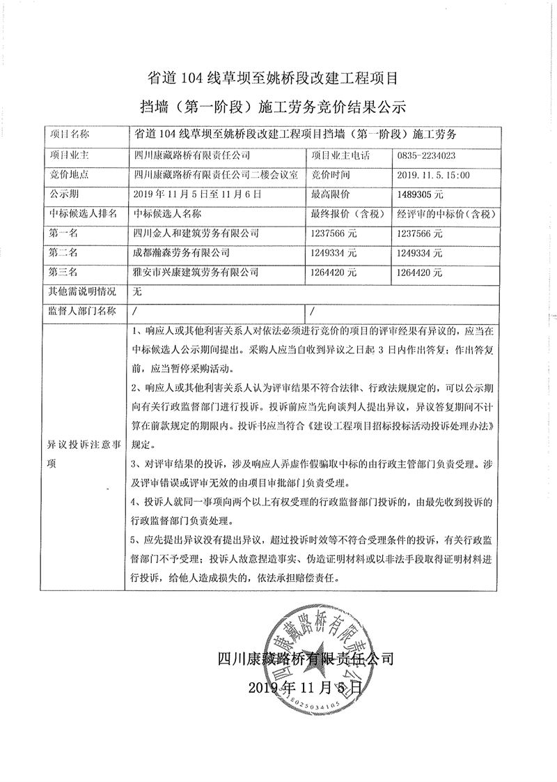 四川康藏路橋有限責任公司省道104線草壩至姚橋段改建工程項目擋墻(第一階段)施工勞務競價結果公示