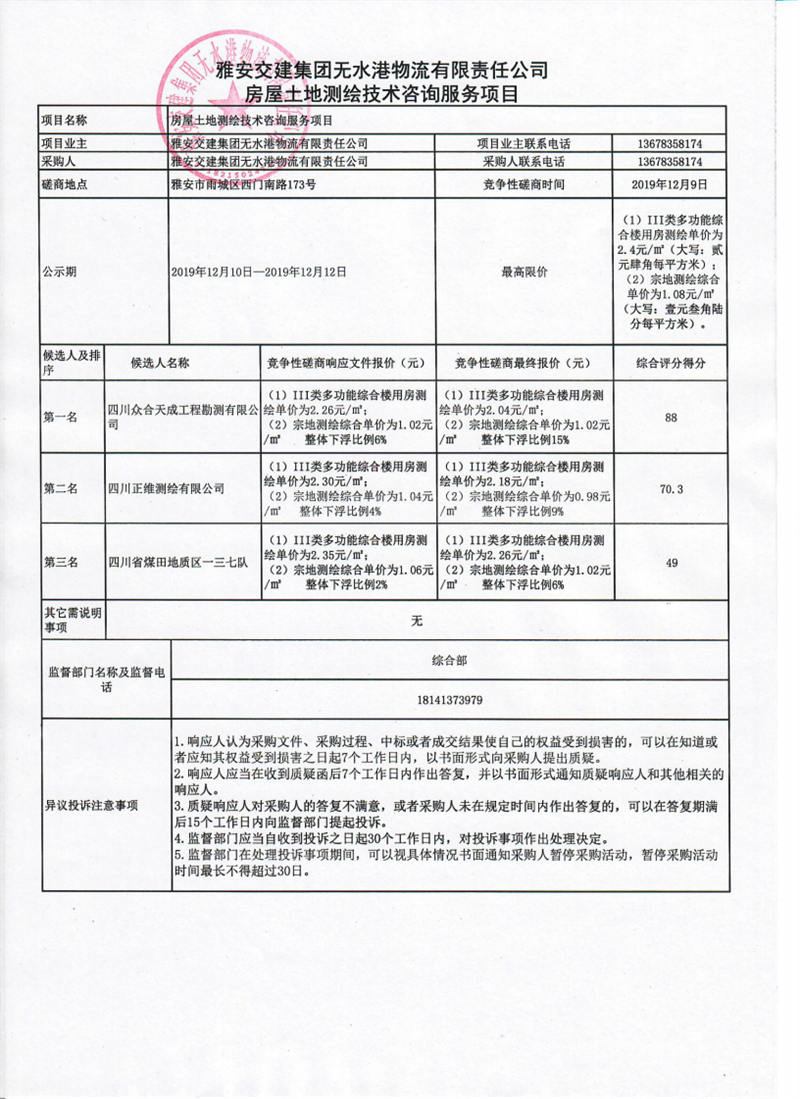 雅安交建集團無水港物流有限責任公司房屋土地測繪技術咨詢服務項目競爭性磋商結果公示