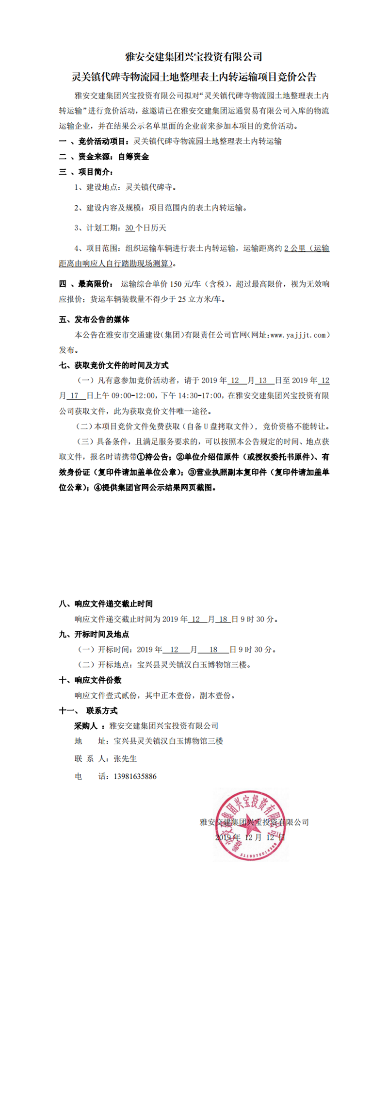 雅安交建集團(tuán)興寶投資有限公司靈關(guān)鎮(zhèn)代碑寺物流園土地整理表土內(nèi)轉(zhuǎn)運(yùn)輸項(xiàng)目競價(jià)公告