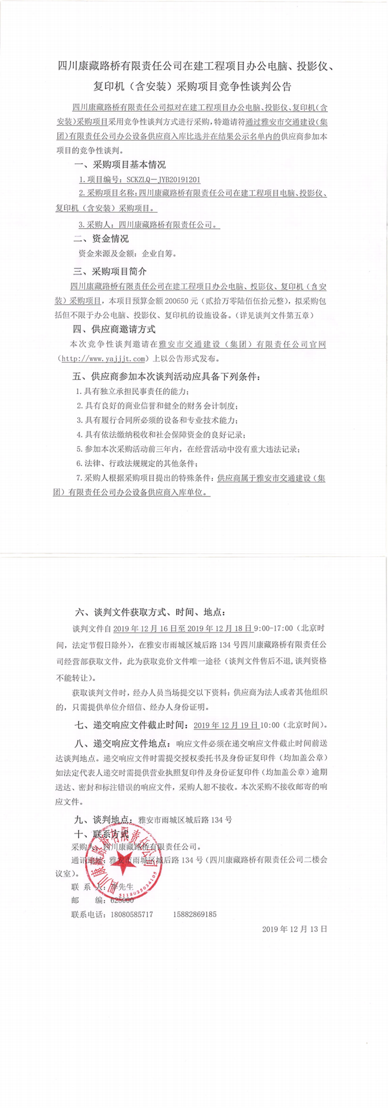 四川康藏路橋有限責任公司在建工程項目辦公電腦、投影儀、復印機(含安裝)采購項目競爭性談判公告