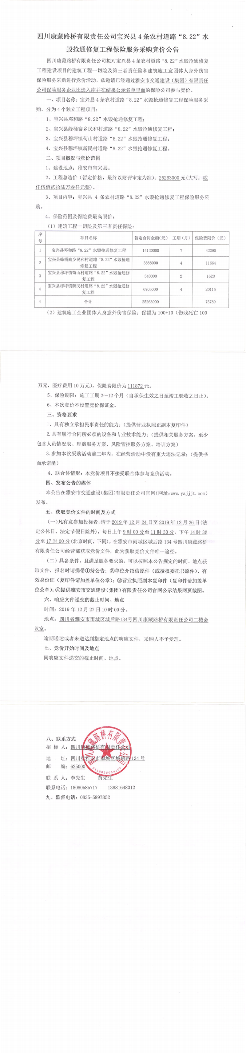 四川康藏路橋有限責(zé)任公司寶興縣4條農(nóng)村道路“8.22”水毀搶通修復(fù)工程保險(xiǎn)服務(wù)采購競(jìng)價(jià)公告