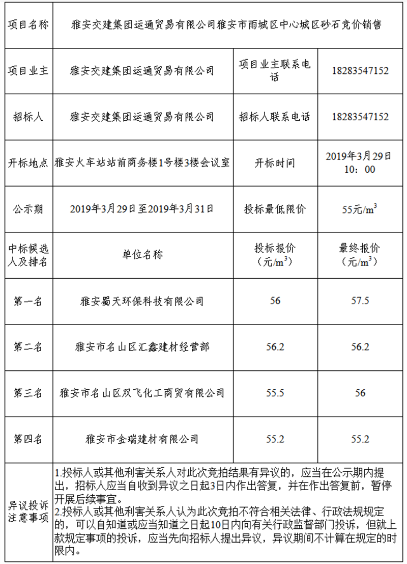 雅安交建集團運通貿易有限公司關于雅安市雨城區(qū)中心城區(qū)砂石競拍結果公示