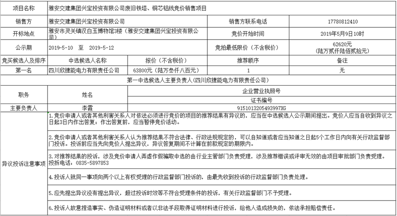 雅安交建集團(tuán)興寶投資有限公司廢舊鐵塔、銅芯鋁線(xiàn)競(jìng)價(jià)銷(xiāo)售項(xiàng)目公示