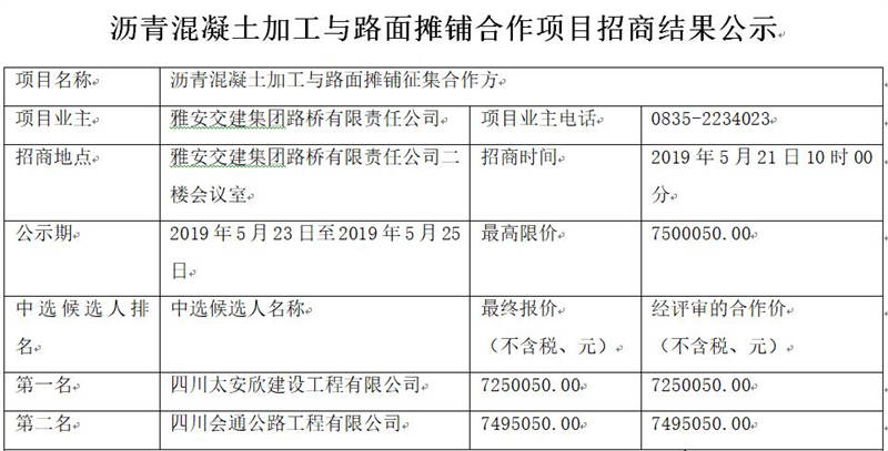 雅安交建集團路橋有限責任公司瀝青混凝土加工與路面攤鋪合作項目招商結(jié)果公告