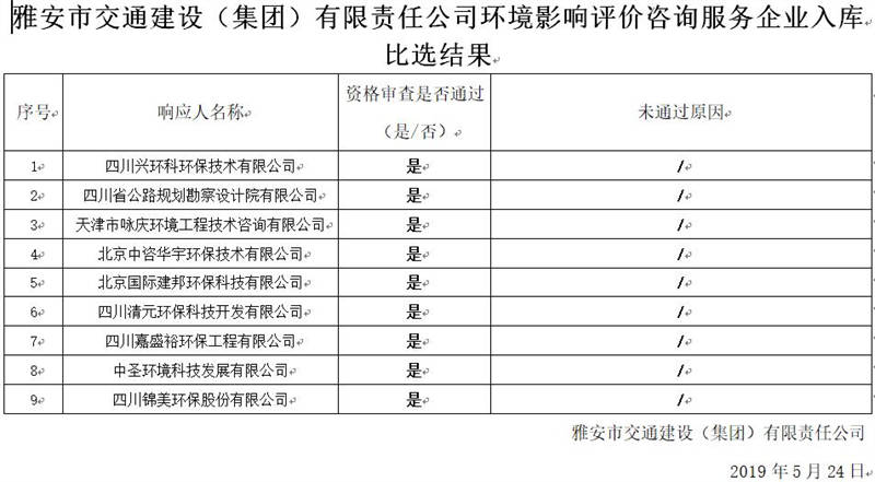 雅安市交通建設(shè)(集團(tuán))有限責(zé)任公司環(huán)境影響評(píng)價(jià)咨詢服務(wù)企業(yè)入庫(kù)比選結(jié)果公示