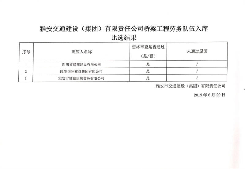 雅安交通建設(集團)有限責任公司橋梁工程勞務隊伍入庫比選結果