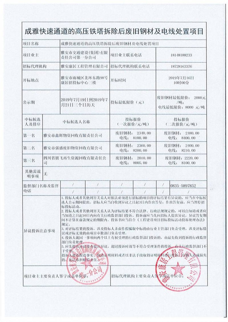雅安市交通建設(shè)(集團(tuán))有限責(zé)任公司第一分公司成雅快速通道的高壓鐵塔拆除后廢舊鋼材及電線處置項(xiàng)目競價(jià)結(jié)果公示