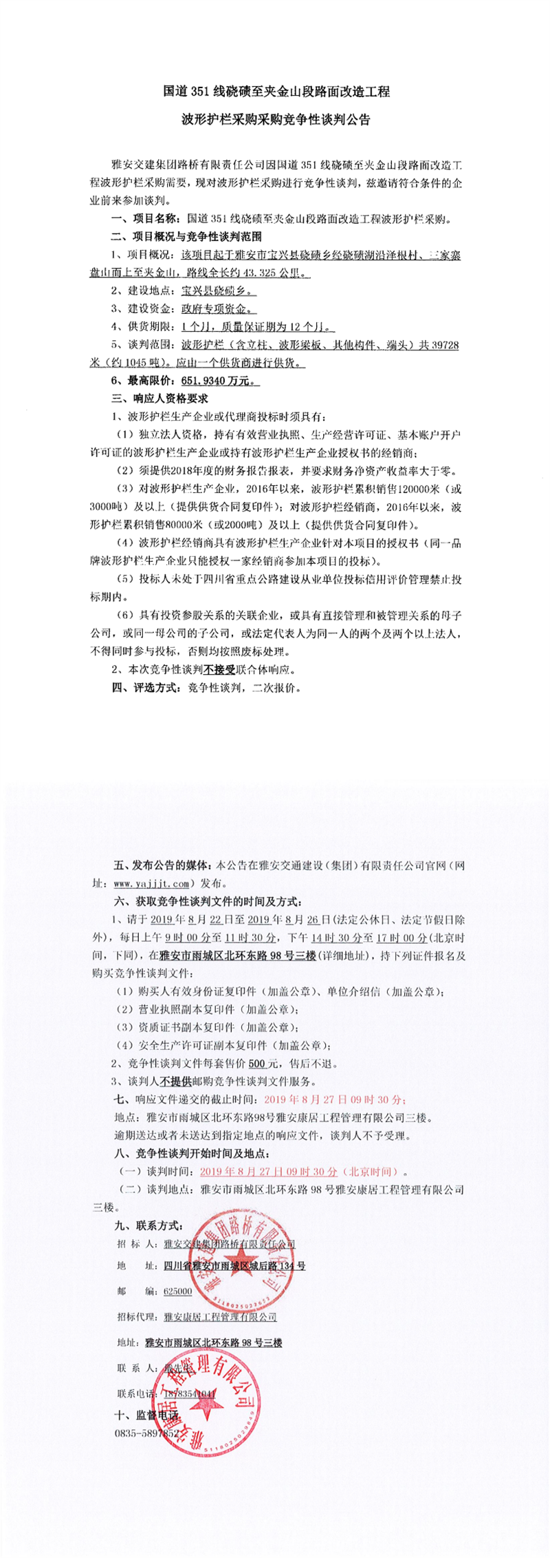 雅安交建集團(tuán)路橋有限責(zé)任公司國道351線磽磧至夾金山段路面改造工程波形護(hù)欄采購項(xiàng)目競爭性談判公告
