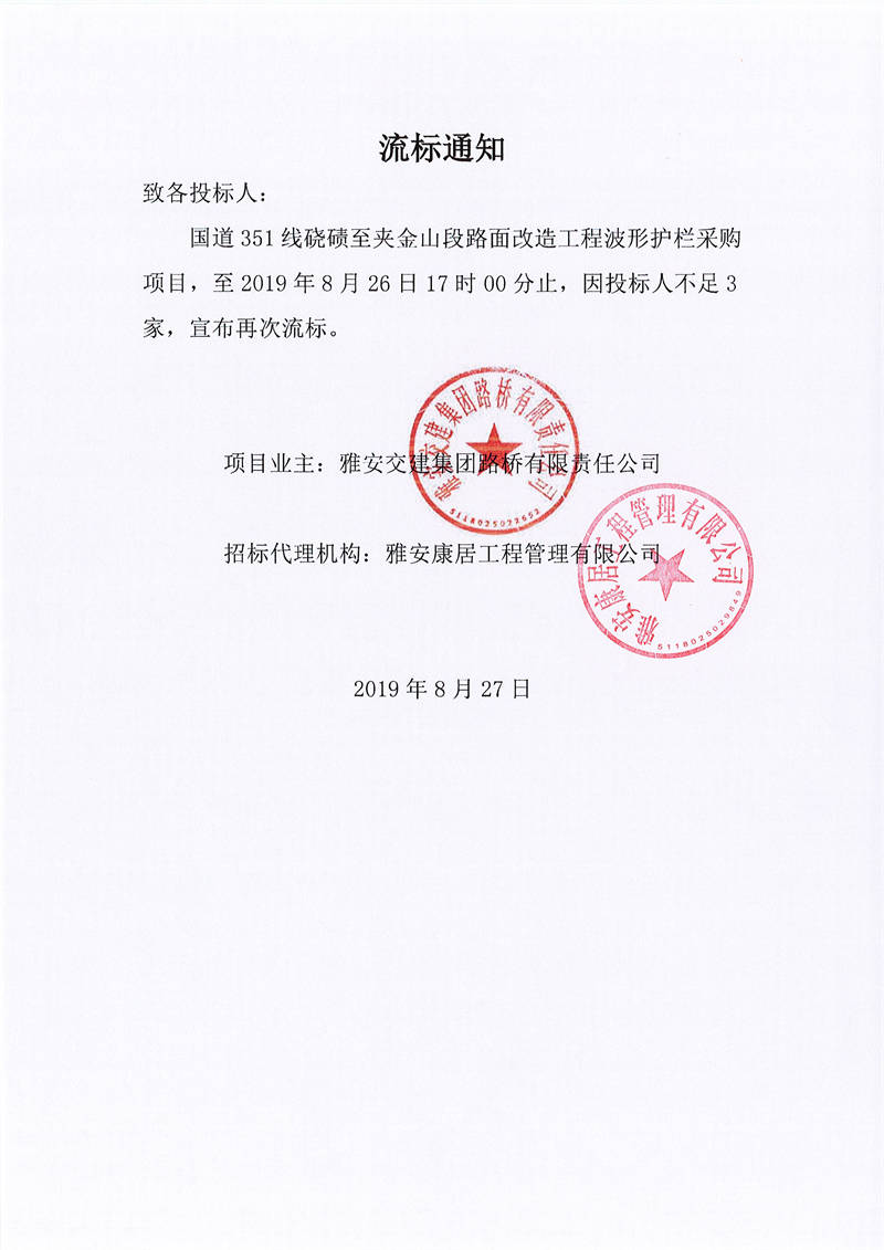 雅安交建集團(tuán)路橋有限責(zé)任公司國(guó)道351線(xiàn)蹺磧至夾金山段路面改造工程波形護(hù)欄采購(gòu)項(xiàng)目流標(biāo)通知