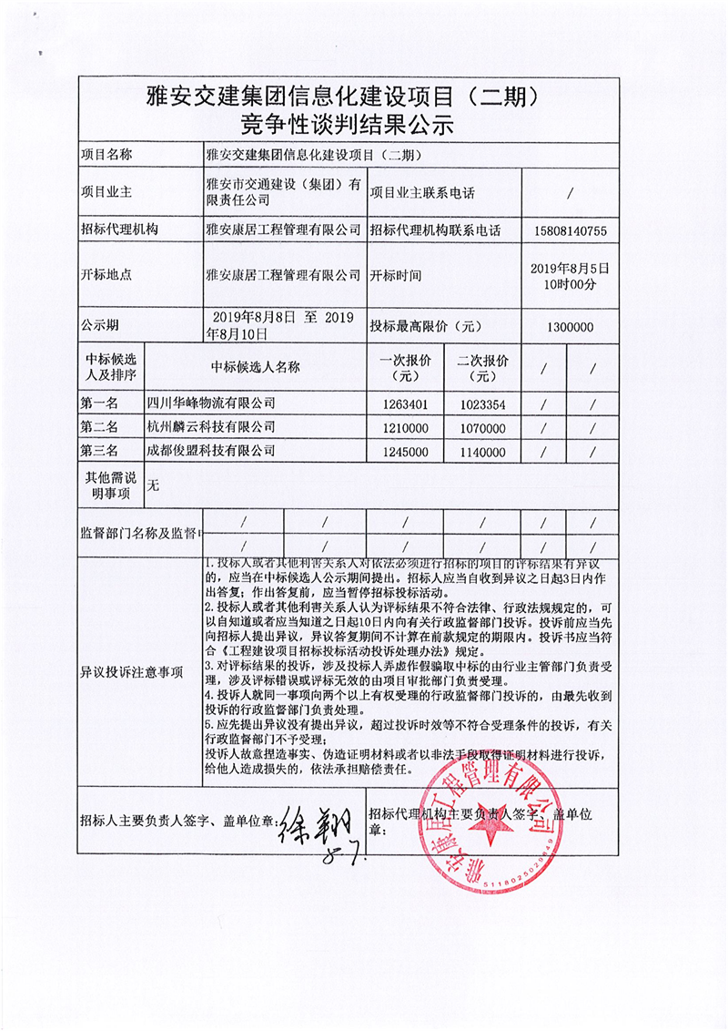 雅安交建集團信息化建設(shè)項目(二期)競爭性談判結(jié)果公示