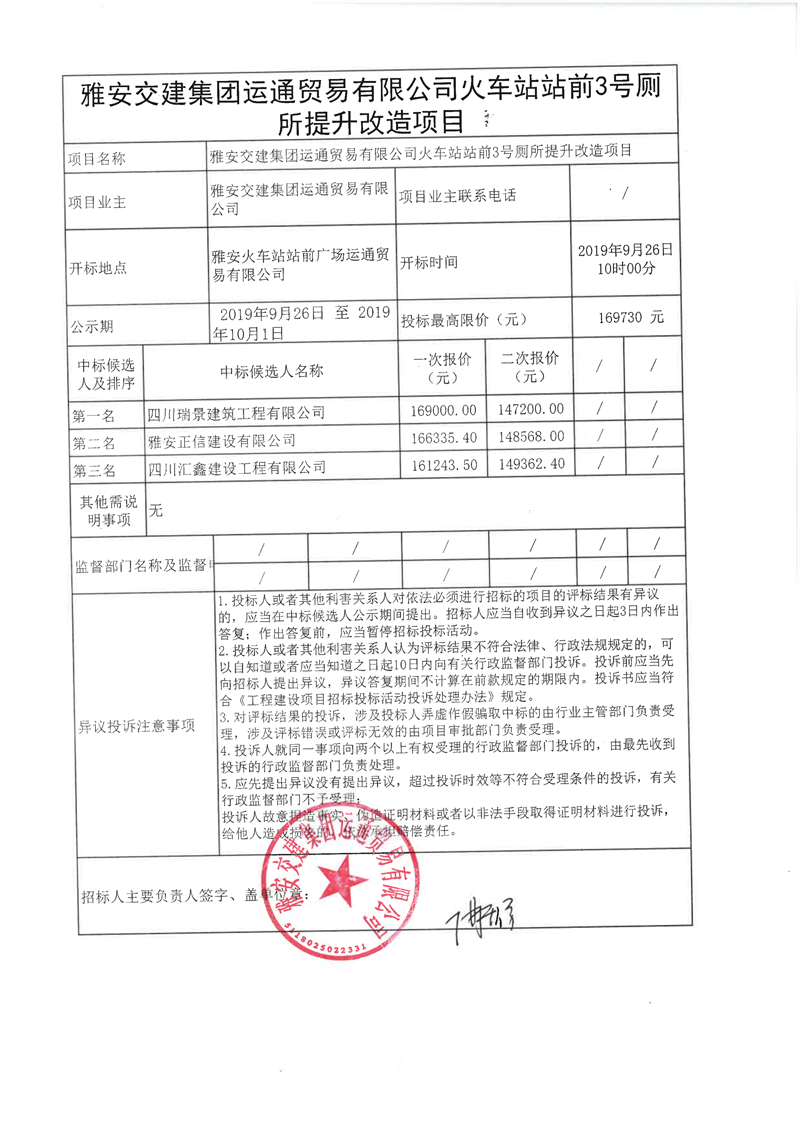 雅安交建集團(tuán)運(yùn)通貿(mào)易有限公司火車站站前廣場3號廁所改造提升項(xiàng)目(第二次)競爭性談判結(jié)果公示