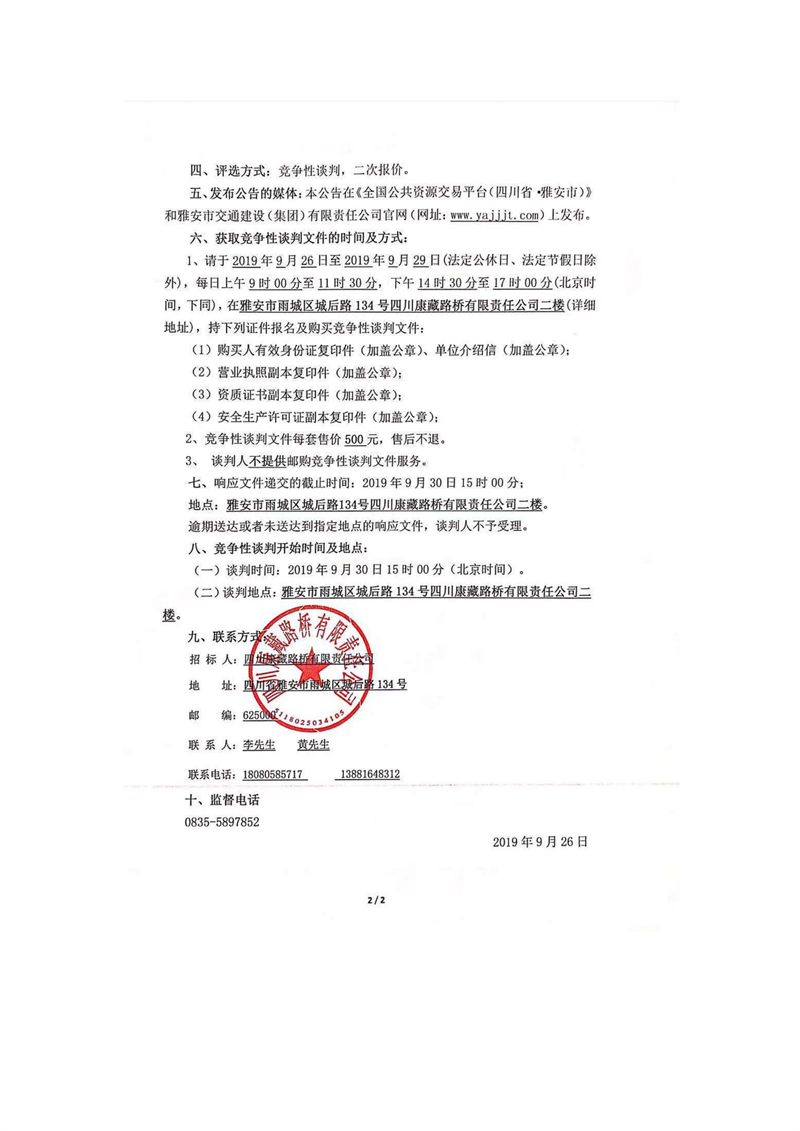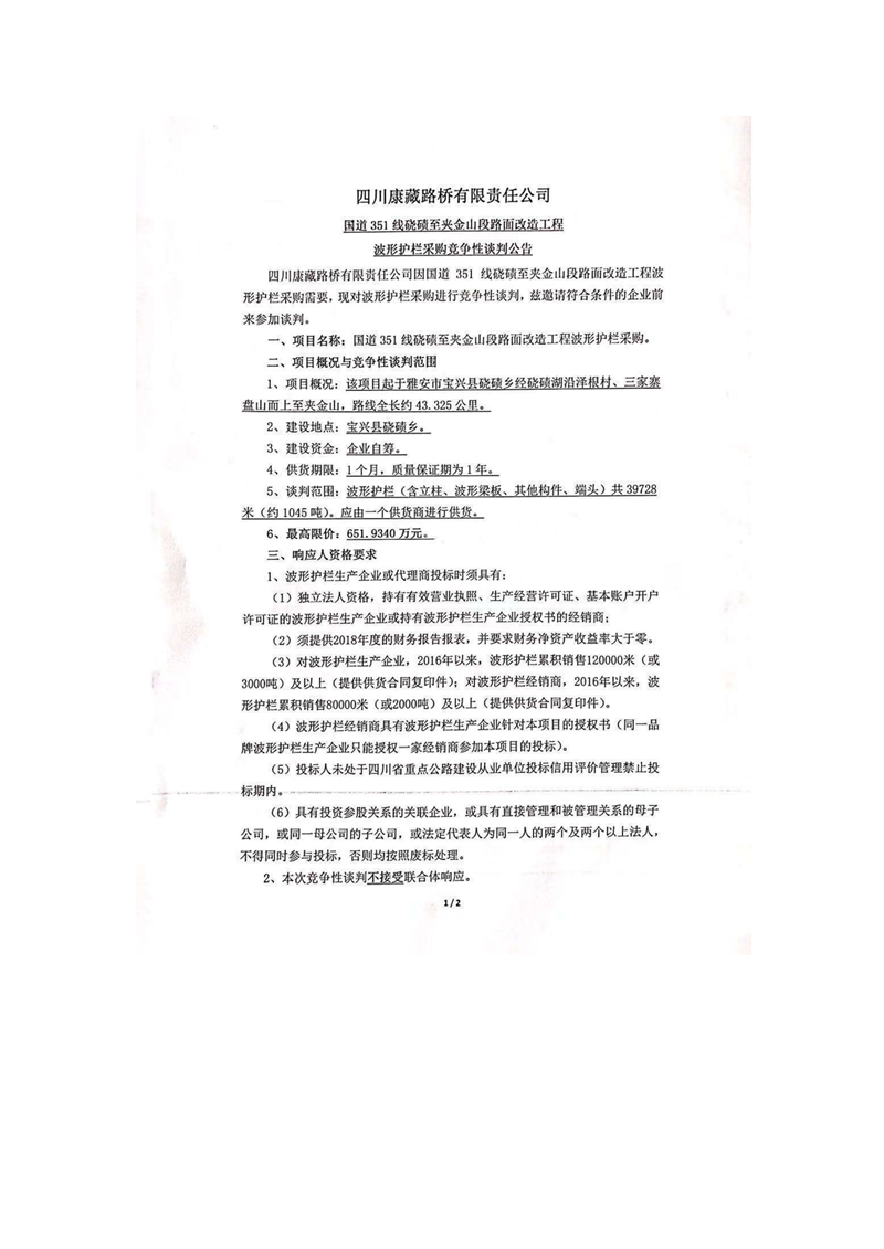四川康藏路橋有限責(zé)任公司國(guó)道351線磽磧至夾金山段路面改造工程波形護(hù)欄采購(gòu)競(jìng)爭(zhēng)性談判公告