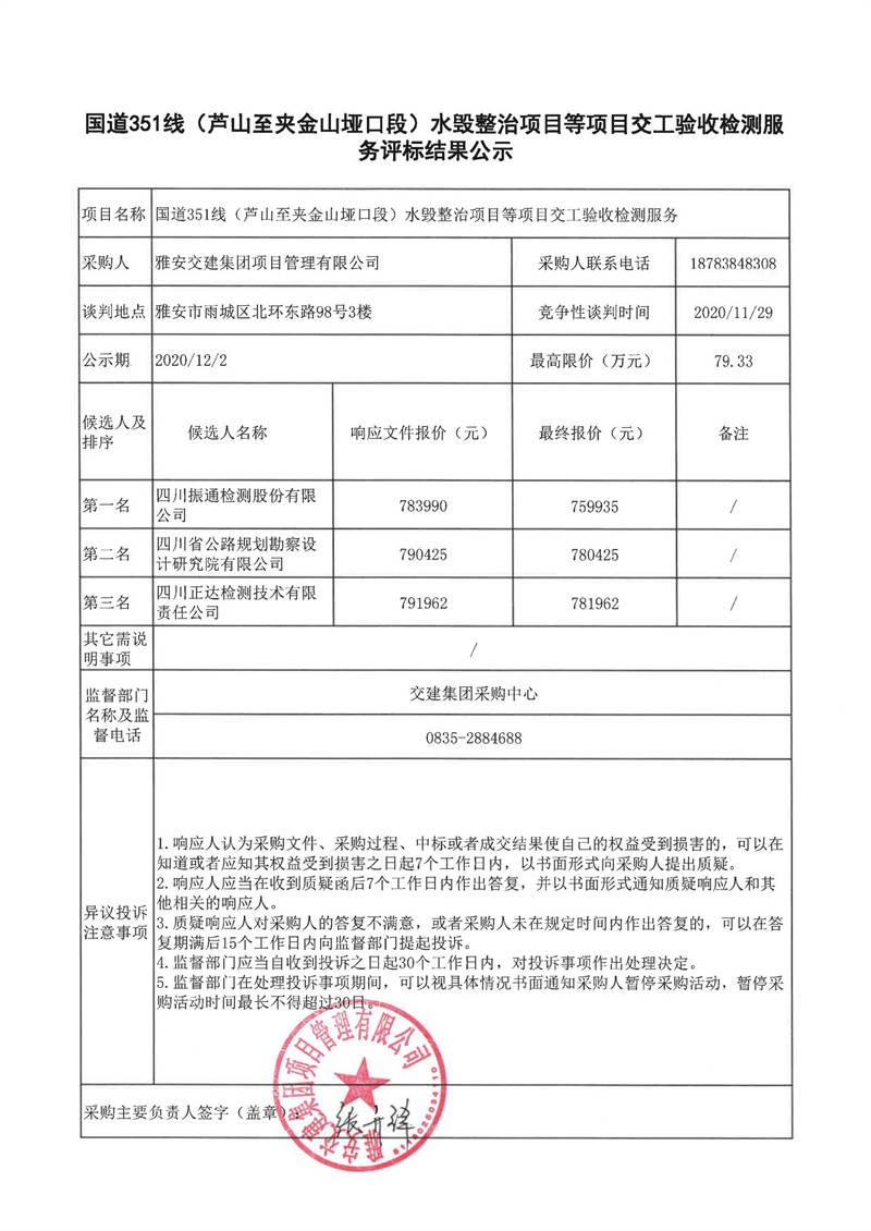 雅安交建集團(tuán)項(xiàng)目管理有限公司國道351線(蘆山至夾金山埡口段)水毀整治項(xiàng)目等項(xiàng)目交工驗(yàn)收檢測(cè)服務(wù)評(píng)標(biāo)結(jié)果公示