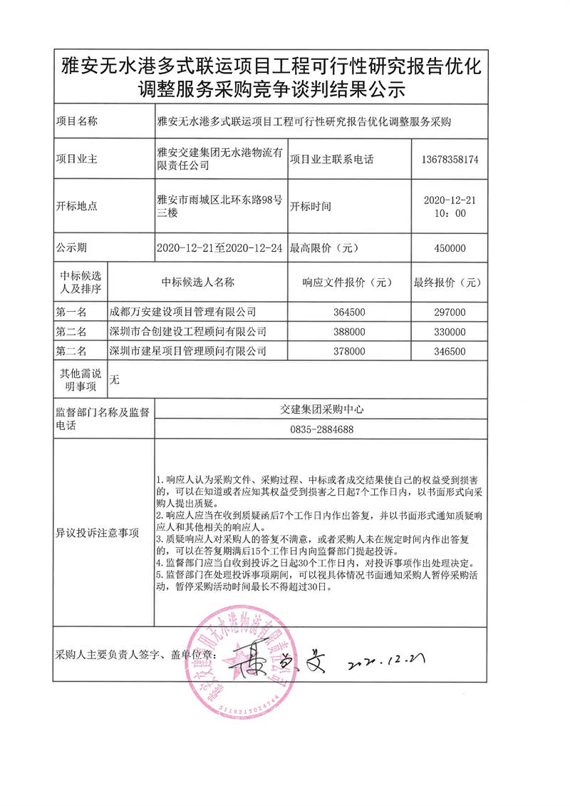 雅安交建集團無水港物流有限責任公司雅安無水港多式聯運項目工程可行性研究報告優(yōu)化調整服務采購競爭談判結果公示