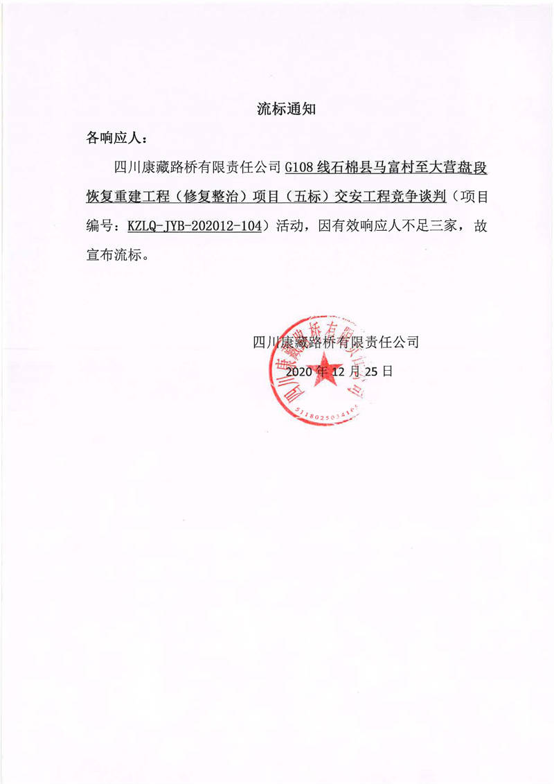 四川康藏路橋有限責(zé)任公司G108線石棉縣馬富村至大營(yíng)盤段恢復(fù)重建工程(修復(fù)整治)項(xiàng)目(五標(biāo))交安工程流標(biāo)通知