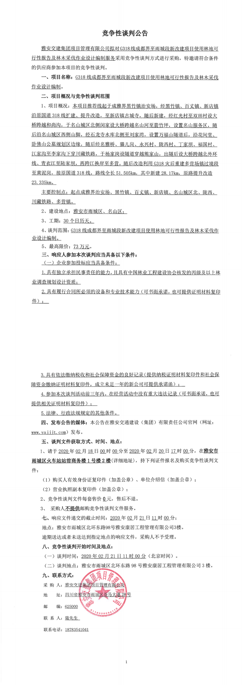 雅安交建集團(tuán)項(xiàng)目管理有限公司G318線成都界至雨城段新改建項(xiàng)目使用林地可行性報(bào)告及林木采伐作業(yè)設(shè)計(jì)編制競(jìng)爭(zhēng)性談判公告