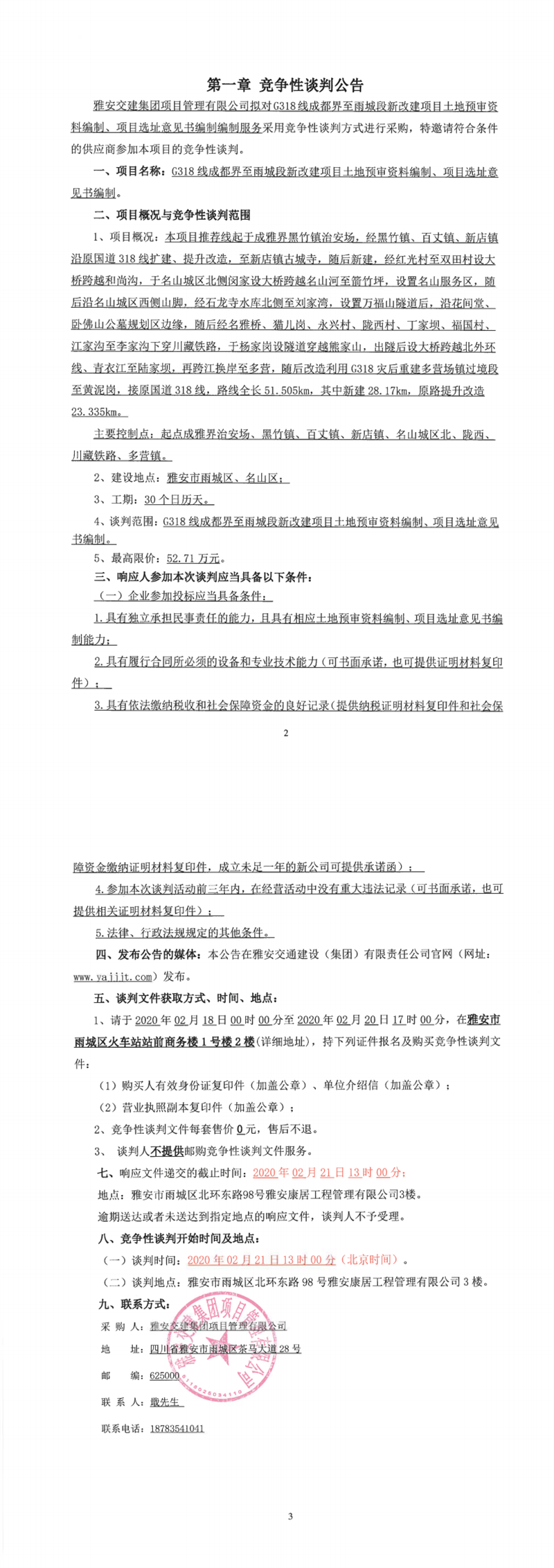 雅安交建集團(tuán)項(xiàng)目管理有限公司G318線成都界至雨城段新改建項(xiàng)目土地預(yù)審資料編制、項(xiàng)目選址意見(jiàn)書(shū)編制競(jìng)爭(zhēng)性談判公告