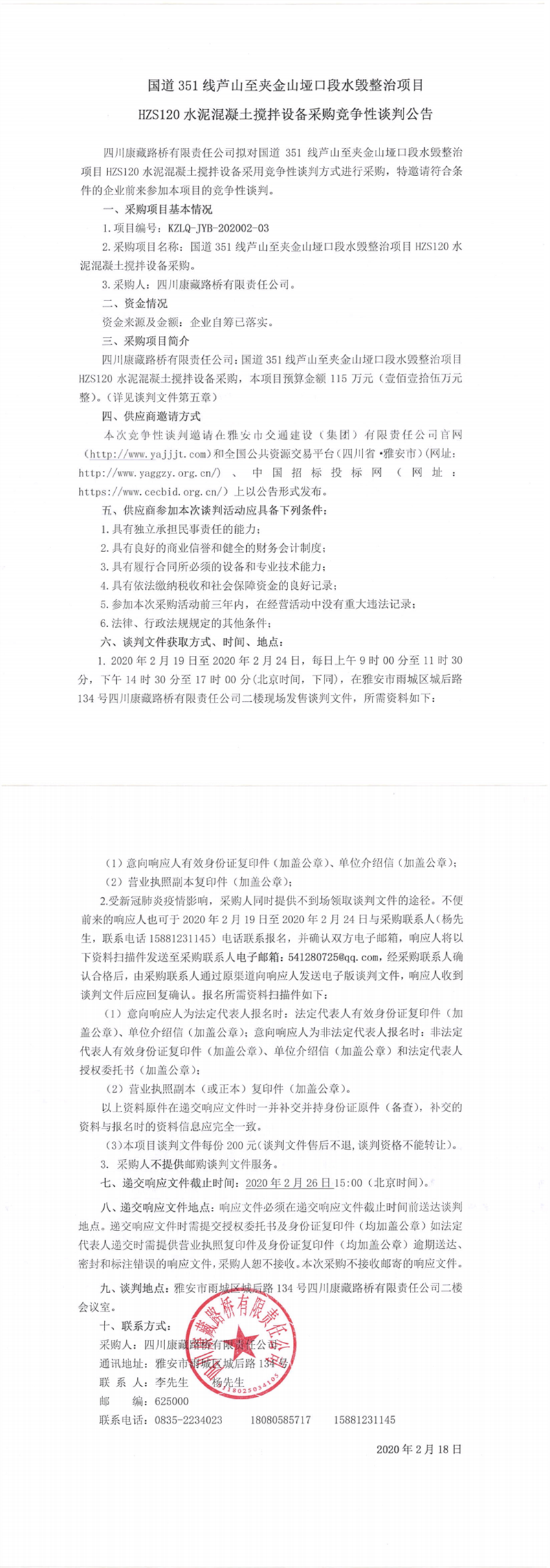 四川康藏路橋有限責(zé)任公司國道351線蘆山至夾金山埡口段水毀整治項目 HZS120水泥混凝土攪拌設(shè)備采購競爭性談判公告