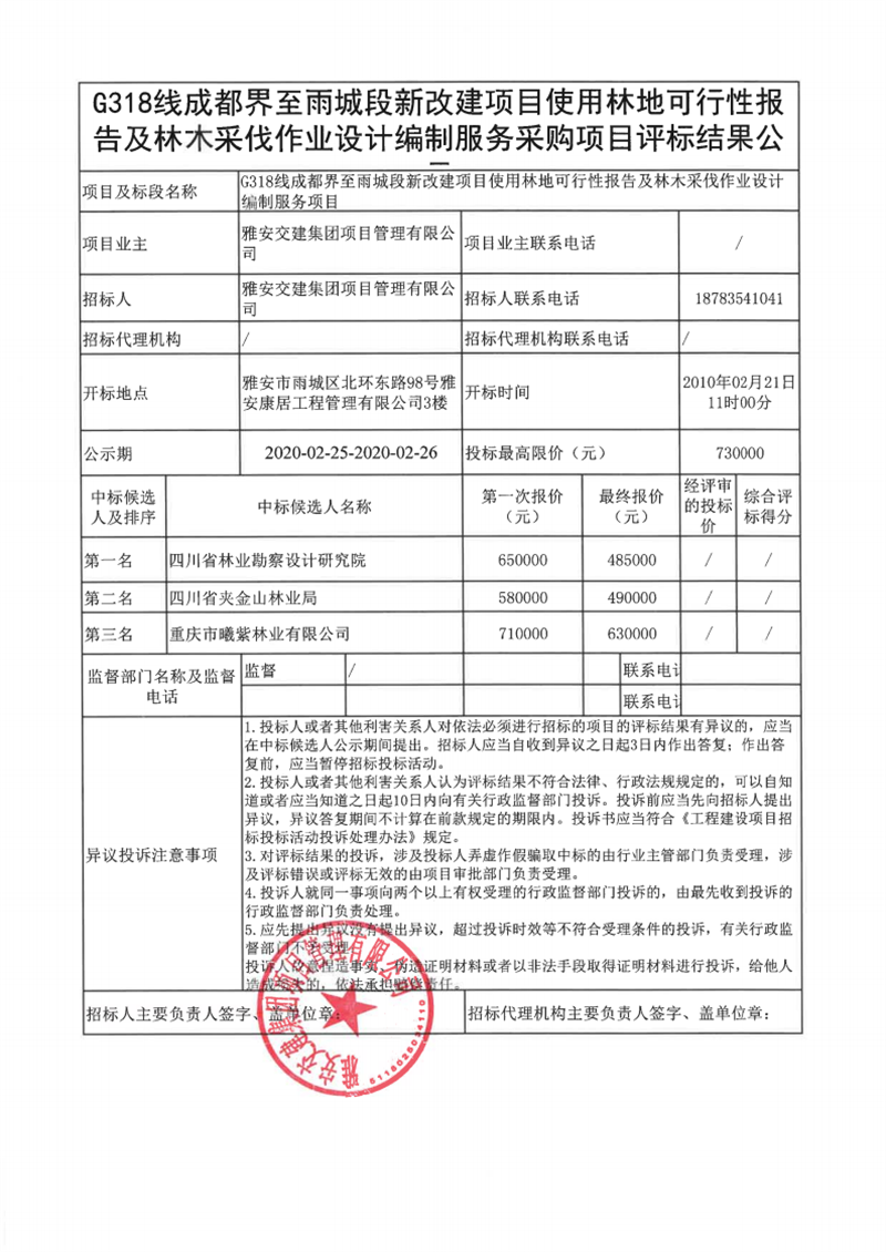 雅安交建集團項目管理有限公司G318線成都界至雨城段新改建項目使用林地可行性報告及林木采伐作業(yè)設計編制服務采購項目評標結(jié)果公示