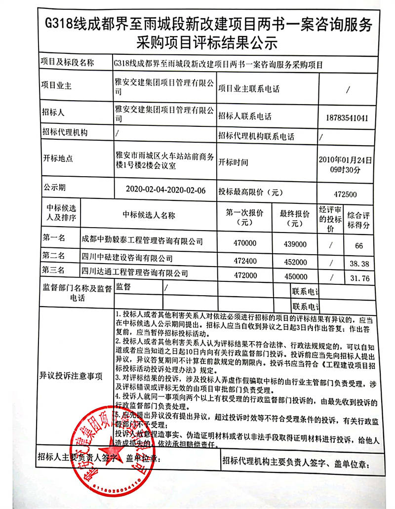 雅安交建集團項目管理有限公司G318線成都界至雨城段新改建項目兩書一案咨詢服務采購項目評標結(jié)果公示