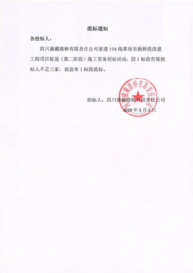 四川康藏路橋有限責(zé)任公司省道104線草壩至姚橋段改建工程項(xiàng)目樁基(第二階段)施工勞務(wù)流標(biāo)通知