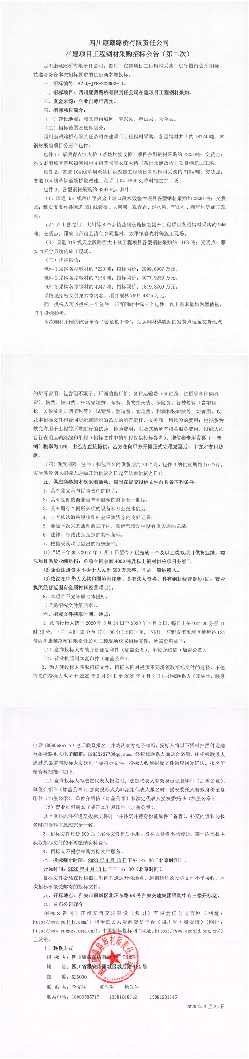 四川康藏路橋有限責(zé)任公司在建項目工程鋼材采購招標公告(第二次)
