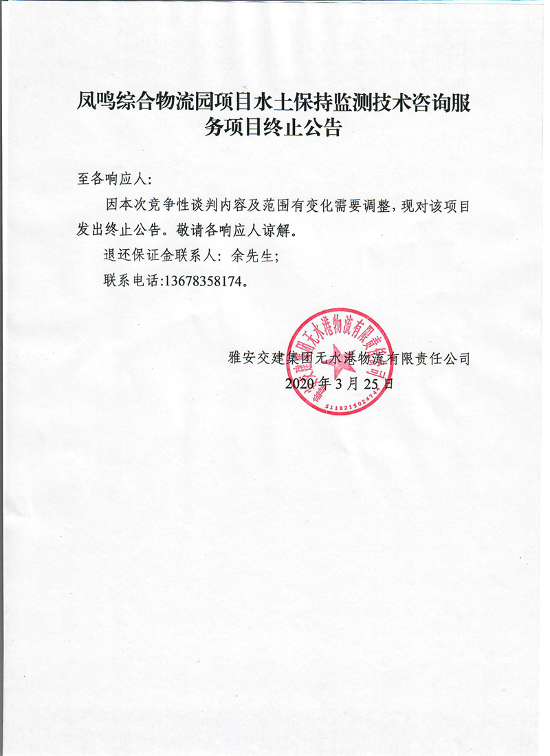 雅安交建集團(tuán)無(wú)水港物流有限責(zé)任公司鳳鳴綜合物流園項(xiàng)目水土保持監(jiān)測(cè)技術(shù)咨詢(xún)服務(wù)項(xiàng)目終止公告