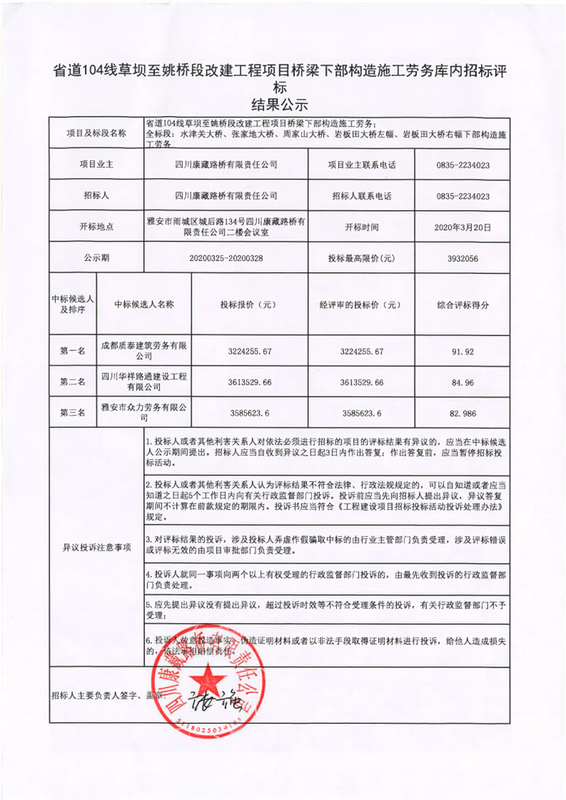 四川康藏路橋有限責(zé)任公司省道104線草壩至姚橋段改建工程項(xiàng)目橋梁下部構(gòu)造施工勞務(wù)評(píng)標(biāo)結(jié)果公示