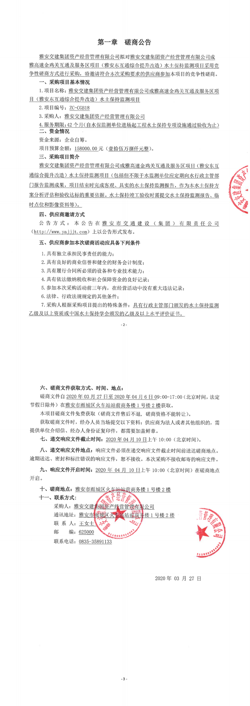 雅安交建集團(tuán)資產(chǎn)經(jīng)營管理有限公司成雅高速金雞關(guān)互通及服務(wù)區(qū)項(xiàng)目(雅安東互通綜合提升改造)水土保持監(jiān)測(cè)項(xiàng)目競(jìng)爭(zhēng)性磋商公告