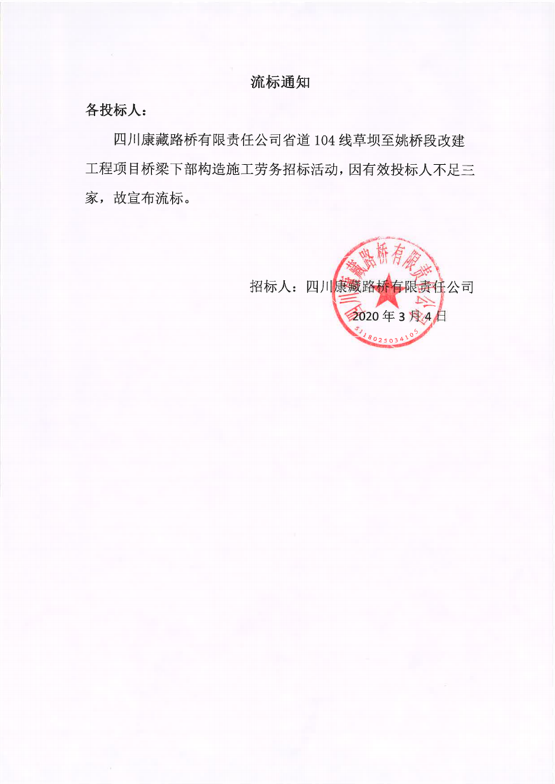 四川康藏路橋有限責(zé)任公司省道104線草壩至姚橋段改建工程項(xiàng)目橋梁下部構(gòu)造施工勞務(wù)流標(biāo)通知